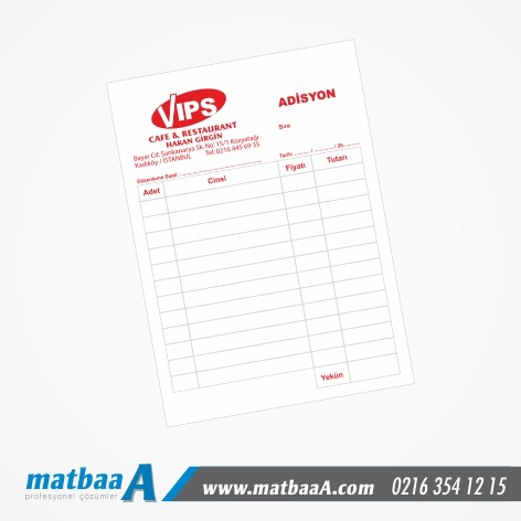Adisyonlar daha çok lokanta, restaurant, cafe vb. yerlerde kullanılan hesap için yazılan fişlerdir. Cilti şekilde ve ofset baskı tekniğiyle baskıları yapılır. Adisyon fiyatları ölçüsüne, üzerindeki renk sayısına ve cilt sayısına göre değişiklik göstermektedir. Ucuz adisyon basımı için küçük, az renkli ve cilt sayısı fazla olarak siparişi verilmelidir.